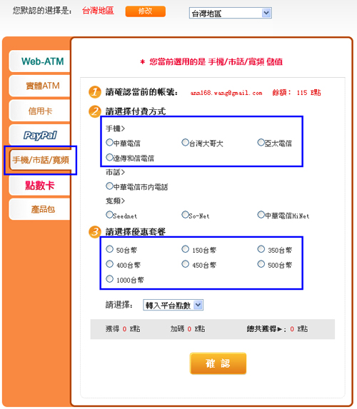 一. 選擇儲值方式及金額後按『確認』