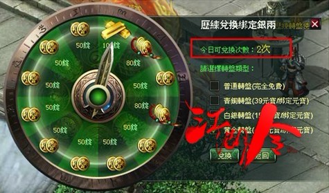 轉盤分為若干個區域,每個區域為一種不同大小的獎勵。點擊兌換按鈕後,轉盤的指標開始轉動,這個時候就是考驗人品的時候後,有大銅錢小銅錢,最後指標落到哪個區域則獲得該區域的獎勵。如果你不小心人品飆升的話,那麼一下就可以獲得意外的財富,每日只有兩次兌換次數喔!
