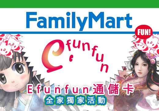 至全省全家FamiPort 點選『儲值』→『線上遊戲』→請選擇購買項目『MyCard Efunfun 通儲卡』→ 請選擇購買面額『150、400、 1000、2000元』 → 請選擇購買數量(一次最多可買9張),並點選『確認輸入』→『確認,列印繳費單』→ 至櫃台繳費→ 結帳後,可取得印有MyCard Efunfun 通儲卡150、400、1000、2000元序號、密碼1組之熱感紙。