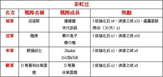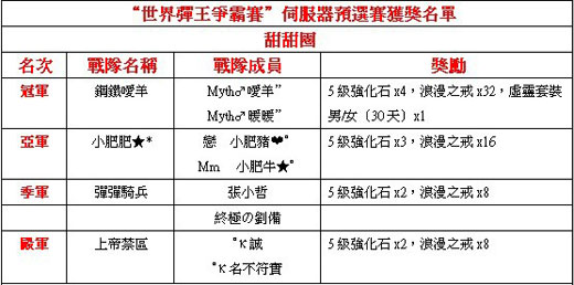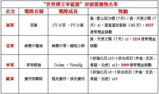 世界彈王爭霸賽のEfunfun賽區突圍賽已經在緊張而又刺激的氣氛中結束,下面公佈本次大賽所有獲得名次的玩家名單和所獲得的獎勵: