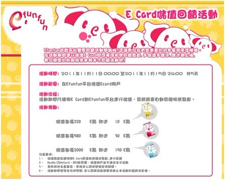 活動內容:活動期間凡使用E Card對Efunfun平台進行儲值,系統將會自動回贈相應點數。