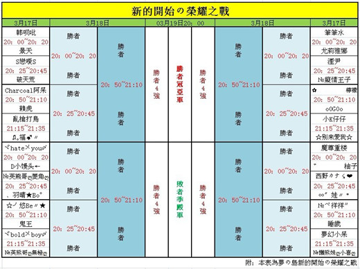 戰鼓擂鳴,夢開始的地方夢の島「新的開始の榮耀之戰」拉開序幕,比賽選手已經產生,新的開始新的挑戰,各位彈友加油吧!