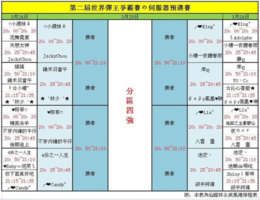 仙蹤林&疾風港「第二屆世界彈王爭霸賽の伺服器預選賽」已經打響,經過一晚激烈的搶奪,16強已經產出,恭喜以下各位! 16強比賽將在3月25日進行!