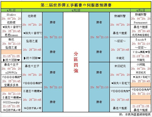 墜星湖「第二屆世界彈王爭霸賽の伺服器預選賽」已經打響,經過一晚激烈的搶奪,16強已經產出,恭喜以下各位! 16強比賽將在4月2日進行!