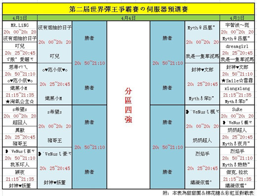 甜甜圈&棉花糖&彩虹豆「第二屆世界彈王爭霸賽の伺服器預選賽」已經打響,經過一晚激烈的搶奪,16強已經產出,恭喜以下各位! 16強比賽將在4月4日進行!