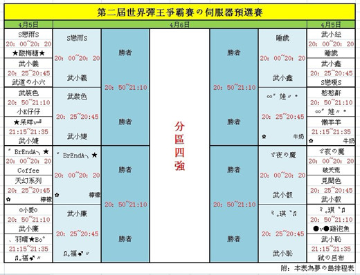 夢の島「第二屆世界彈王爭霸賽の伺服器預選賽」已經打響,經過一晚激烈的搶奪,16強已經產出,恭喜以下各位! 16強比賽將在4月6日進行!