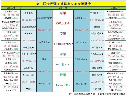 巾幗不讓鬚眉,女兒亦著銀鎧!經過2日的激戰,“第二屆世界彈王爭霸賽の美女挑戰賽”4強已經產生,讓我們為所有參賽的美女英豪送上熱烈的掌聲!